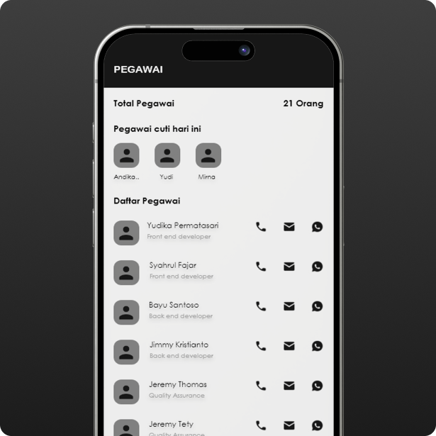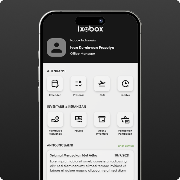 The home page of the IXOBOX Employee App serves as the central dashboard for employees, displaying key features such as attendance tracking, leave requests, overtime management, and financial tools like reimbursements, payslips, and asset inventories. The top section highlights the user's profile, including their name, position, and company affiliation. Below, categorized icons provide quick access to essential HR functions, ensuring employees can efficiently manage their schedules and financial transactions. Additionally, an announcement section keeps users informed about company updates, ensuring seamless communication between management and employees. The intuitive layout enhances user experience, making navigation straightforward and efficient.