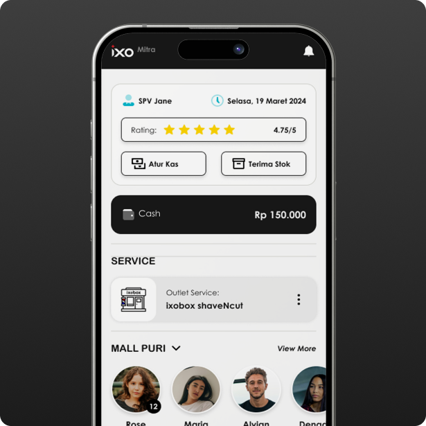 The IXOBOX Outlet page (Outlet Leader - Home) serves as the main dashboard for Outlet Leaders to monitor outlet operations efficiently. This page displays user information, operational dates, and customer ratings. Key features include Manage Cash to manage transactions and Receive Stock to record incoming goods. Customer payment status is also displayed, such as payment method (Cash) and total transaction. In addition, the outlet's main services, such as "ixobox shaveNCut", as well as a list of hairstylists on duty with the number of customers they handle can be monitored directly.