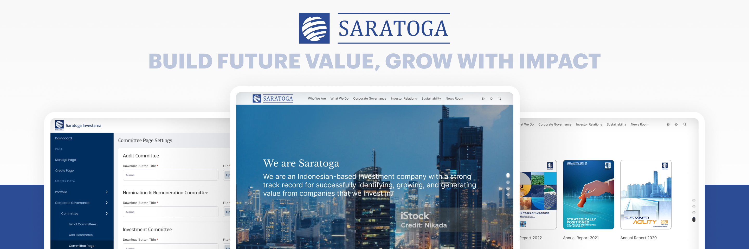 Technopartner Indonesia was entrusted by Saratoga Investama Sedaya to develop a modern and professional corporate website that reflects its identity as a leading active investment company in Indonesia. The project focused on delivering a seamless user experience with a clean, responsive design that highlights Saratoga’s investment portfolio, strategic focus, and financial performance. Key features include an intuitive content management system (CMS) for streamlined updates, an integrated investor relations section with access to reports and disclosures, and interactive components that improve engagement across stakeholders. This digital transformation supports Saratoga’s commitment to transparency, accessibility, and delivering long-term value to its investors and partners.